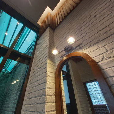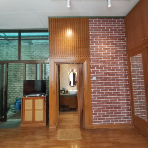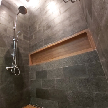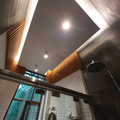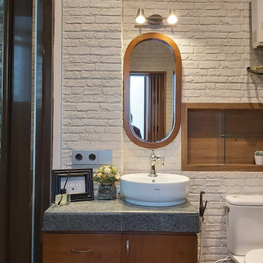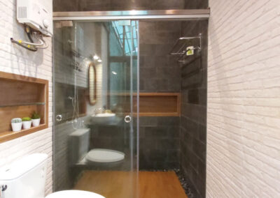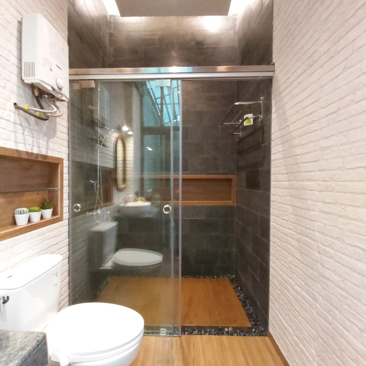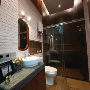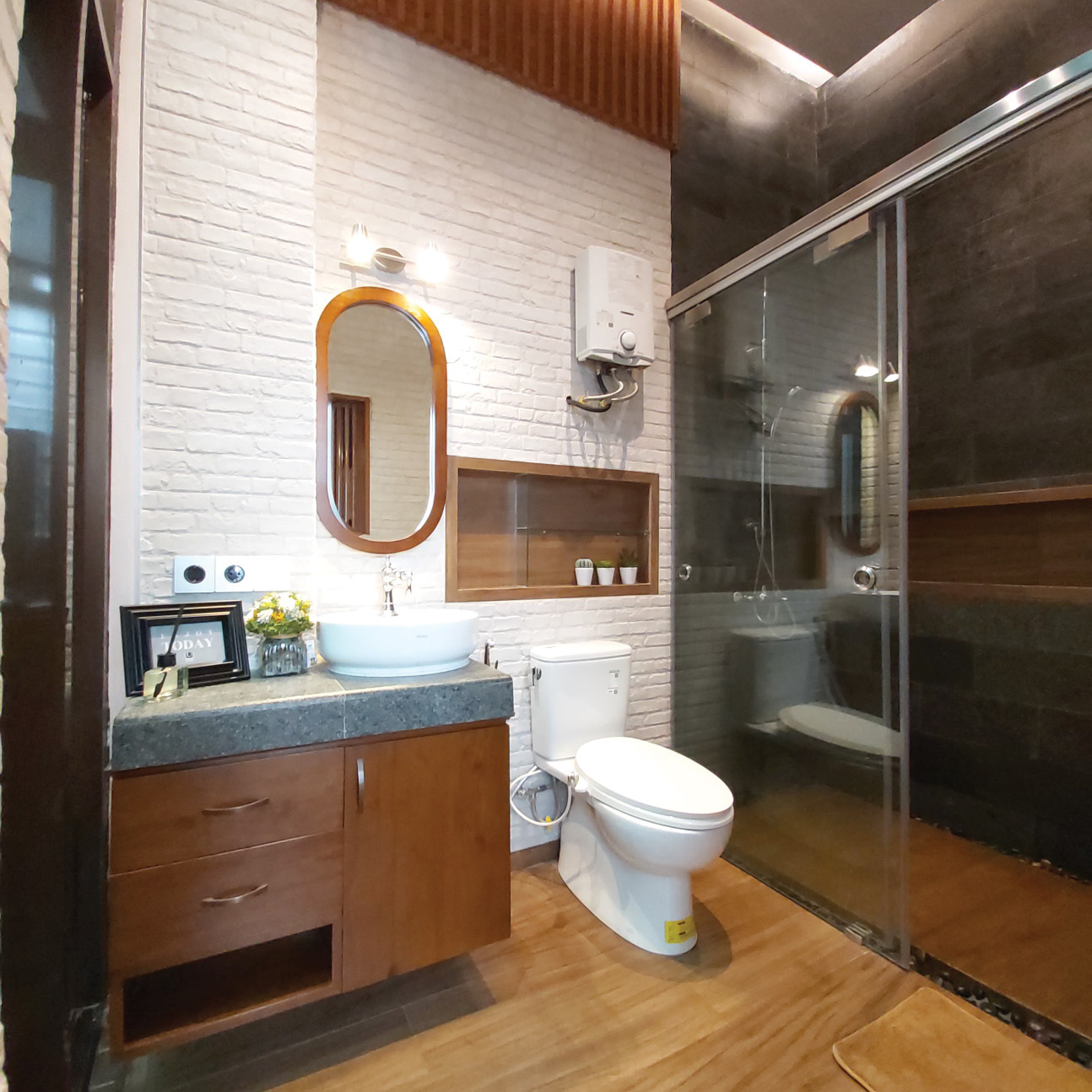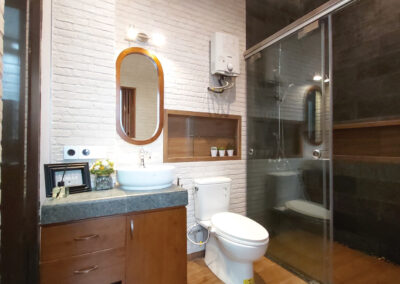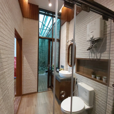 Tocco Indonesia renovated this bathroom with warm wood textures, exposed brick, and dark stone tiles—delivering a calming yet refined space that balances form and function.